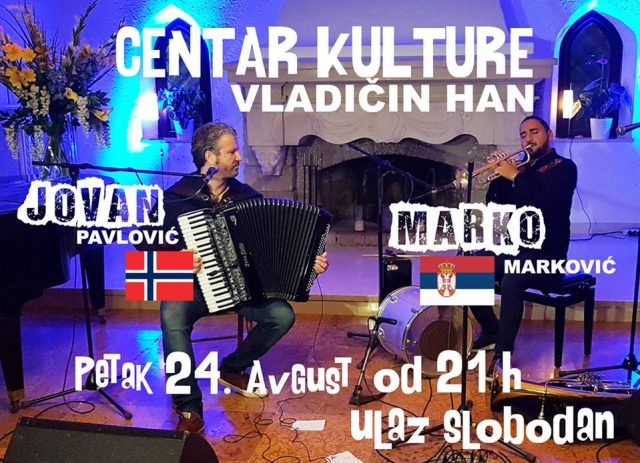 U petak 24. avgusta od 21h u bioskopskoj sali Centra kulture u Vladičinom Hanu, harmonikaš Jovan Pavlović iz Norveške i naš sugrađanin trubač Marko Marković odžaće koncert.