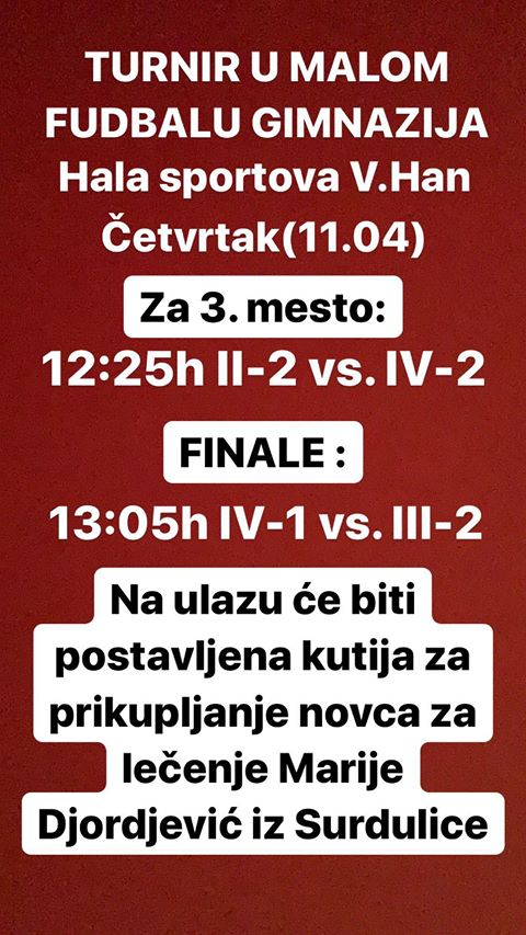 Ovi srednjoškolci danas igraju turnir u malom fudbalu, prva utakmica će se igrati od 12:25h  između odeljenja II/2 i IV/2, dok će se finale održati od 13:05h, a sastaju se odeljenja IV/1 i III/2.