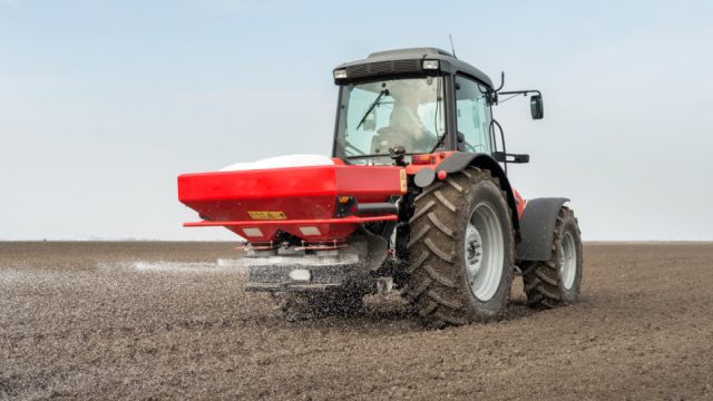 Tractor and fertilizer spreader in field