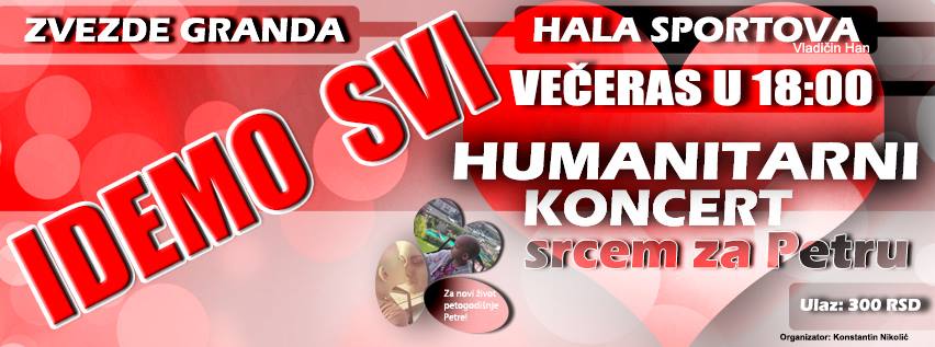 Karte za humanitarni koncert “Srcem za Petru” koji će večeras od 18h biti održan u Sportskoj hali u Hanu biće puštene u prodaju danas I moći će da se kupe na blagajni Centra culture od 12h i u Sportskoj hali od 16h, po ceni od 300 dinara.